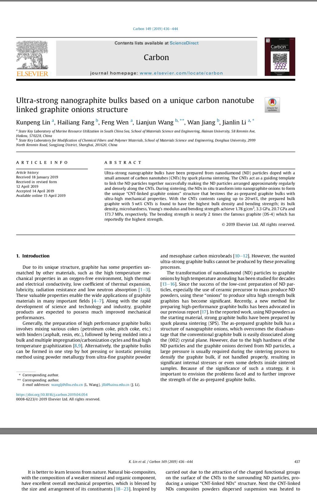 近日,伟德国际victor1946李建林教授、文峰教授科研团队在高性能石墨材料研究中取得重要进展。 这项工作的部分研究成果发表在碳结构材料的国际顶级期刊Carbon (Ultra-strong nanographite bulks based on a unique carbon nanotube linked graphite onions structure, 2019, 149, 436-444)。 在前期的研究工作基础上,研究人员通过仿生设计,在纳米金刚石粉体中引入少量碳纳米管,巧妙地解决了金刚石粉体转化制备石墨块体内部残余应力较大的难题。所制备的石墨块体为纯石墨相,其抗弯强度达到目前最强石墨材料的2倍,这一工作有望突破石墨材料的高精度加工的技术瓶颈。目前正在和有关单位合作,开发某些领域的专用石墨元器件。 2016级硕士研究生林坤鹏为论文第一作者。这项工作是与东华大学的相关课题组合作共同完成。(文/图:李建林)