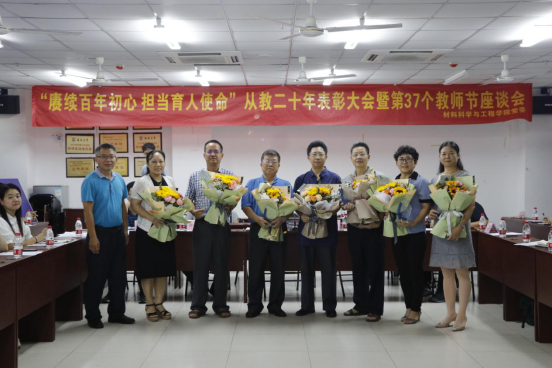 会议学习了伟德国际victor1946“十佳好老师”短片,对“从教二十年”教师进行表彰。员工代表为“从教二十年”教师代表献花,胡先文书记为教师代表颁发奖章。