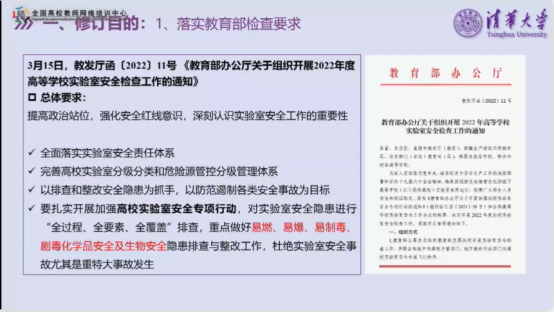 本次培训包含21个课程:《高校实验室安全基础》、《危险化学品安全管理现状与法制建设》、《化学实验室安全设施设备建设与管理》、《化学品危害和风险管理政策评述》、《实验室生物安全与防护》、《实验室特种设备、辐射安全、电气及消防安全》、《化学实验室安全风险识别、控制与事故应急处置》、《高校实验室安全全过程管理的思考与实践》、《关于高校实验室安全管理工作的思考与实践》、《高校实验室安全检查项目表不符合项统计分析-以国矿业大学为例》、《实验室-迟到的法制教育与文化建设》、《化学品事故应急预防安全处置》、《高校实验室危险化学品管理与危废处置痛点探讨》、《易制爆危险化学品治安管理》、《高校实验室安全建设与综合管理》、《实验室通风和净化建设与安全运行》、《实验室气瓶安全管理》、《高校化学试剂库标准化建设和信息化运行》、《高校实验室环境污染治理技术探索与实践》、《中华人民共和国固体废物污染环境防治法》和《医疗机构危险化学品安全管理特定与案例分析》。
