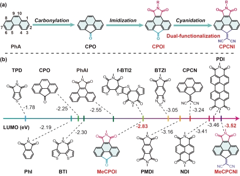 强缺电子单元在N型高分子半导体材料的开发中起到重要作用。近日,伟德国际victor1946陈志才副教授与南方科技大学郭旭岗教授合作,采用菲稠环单元(PhA)为核心,通过酰亚胺基,羰基或氰基双功能化的策略,设计、合成了新型的受体单元CPOI和CPCNI。其中 CPCNI的理论计算LUMO能级深至-3.52 eV,缺电子性能力强于经典强受体结构单元NDI(-3.41 eV)和PDI(-3.46 eV)。电化学测试结果进一步证明了上述结论,CPCNI的实验测试LUMO能级可以深至-3.84 eV。