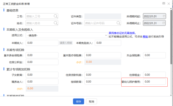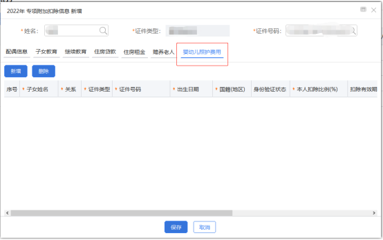 (1)扣除年度为2022年及之后,添加页面才会显示“婴幼儿照护费用”页签。