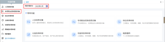 1.在扣缴端首页,选择正确的【税款所属月份】,点击“专项附加扣除信息采集”菜单,进入专项附加扣除信息采集页面。