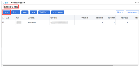 2.进入页面后,【扣除年度】默认显示为首页【税款所属月份】对应的年度。点击【添加】按钮,打开添加页面。