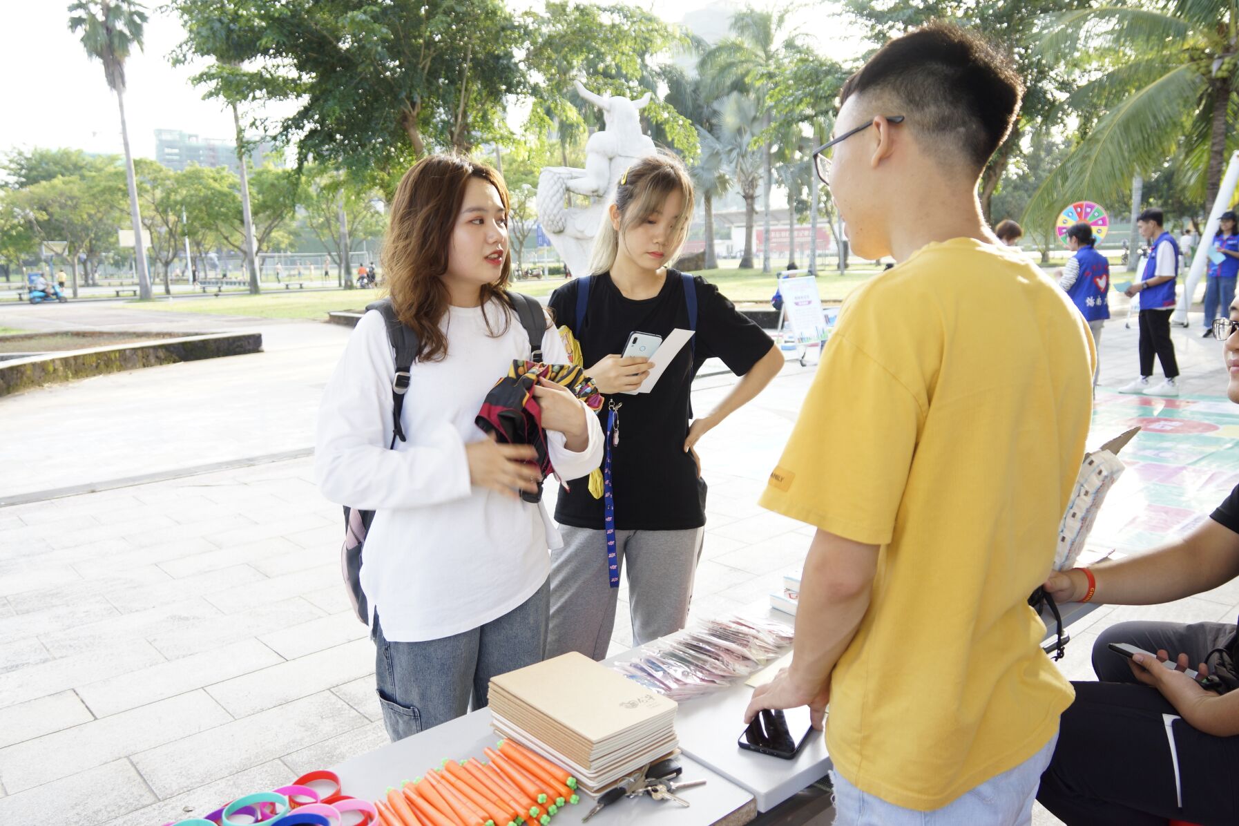 朝气蓬勃的青春在运动场上肆意挥洒汗水,傍晚的城西校区操场上热闹非凡,员工们活力满满,打篮球、跑步、踢足球、跳绳……当志愿者布置好活动现场,立刻引起了同学们的围观。“这是垃圾分类的活动,我家那边特别严格!一会儿我要参加!”来往的员工们充满好奇,共同期待着活动的开始。