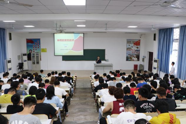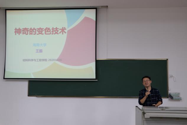 活动伊始,王振教授和同学们讲述了他的科研领域:神奇的变色技术。王振教授为同学们描绘了一个缤纷多彩的世界,提出的四个智能变色技术让同学们再次感叹科学的神奇之处。同时,王振教授为同学们讲解了变色技术在生活生产中的应用,也强调了变色技术举足轻重的地位。最后,王振教授对同学们提出了美好的期许,希望同学们在自己今后的人生路上能够明确方向,奋勇拼搏。