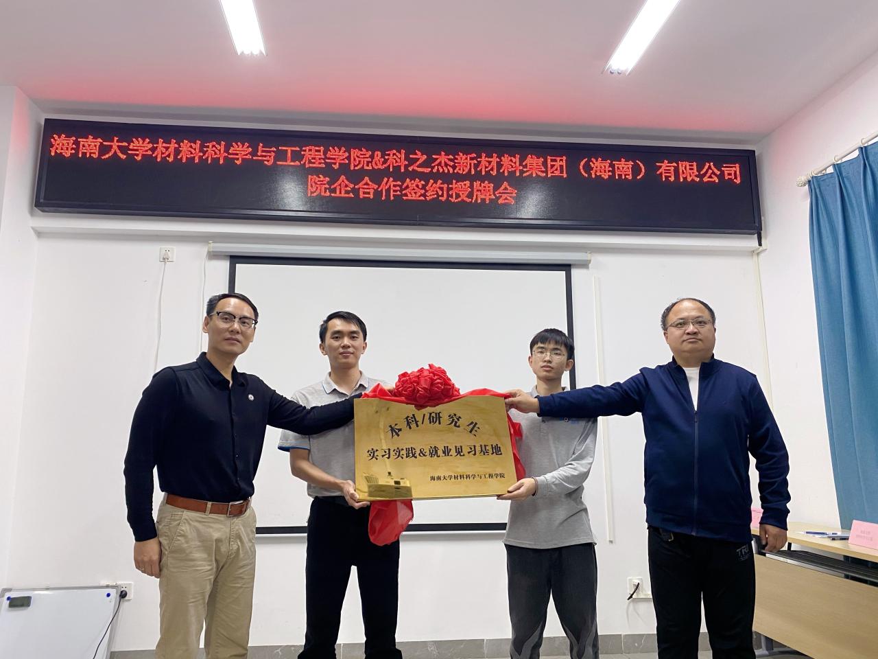 2021年12月15日下午,公司与海南科之杰新材料有限公司在海南澄迈举行了“本科生/研究生产实习见习基地” 共建活动及院企合作共建揭牌仪式。伟德国际victor1946李长久副经理,党委副书记周郭军,材料系主任陈大明、教师代表曾琴丹、科之杰新材料有限公司总经理潘志峰,人事主管王妍、生产部厂长李英祥、技术室主任邱岳涛、营销部经理张彬及公司毕业就职院友代表等参加了本次活动。
